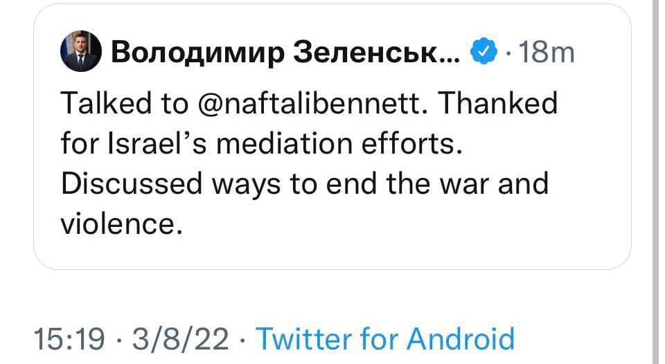 11:42 Новое видео Зеленского. Сказал, что не может поздравить женщин с 8 марта, пока продолжается полномасштабная террористическая война против нашего народа, когда столько смертей, горя и страданий. "Оккупанты снова бомбили Сумы авиабомбами. Наш мирный город, который никогда в истории не угрожал России. Добрая, тихая, душевная Сумщина, которую превращают в пекло. Мариуполь - мирный и трудолюбивый город без какой-то внутренней злобы. Его окружили, заблокировали, специально истощают, пытают, оккупанты сознательно отключают связь, сознательно блокируют подвоз еды, поставки воды, отключают электрику...". В своем обращении он очередной раз обвинил страны Запада в том, что они ничего не делают для того, чтоб остановить авиа- и ракетные удары россиян по Украине. Не закрывают небо, не дают самолёты и система ПВО.