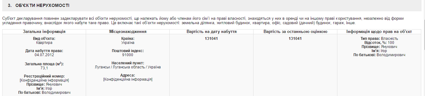 В декларации госслужащего говорится, что Янукович является собственником квартиры в Луганске общей площадью 73,1 кв.м стоимостью порядка 131 тысяча 041 гривна.