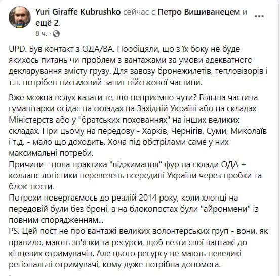 Позже Юрий Кубрушко добавил, что у него был контакт с ОГА/ВА. и там пообещали, что с их стороны не будет никаких вопросов или проблем с грузами при адекватном декларировании содержания груза. Например, для завоза бронежилетов, тепловизоров и т.д. требуется листовой запрос воинской части.