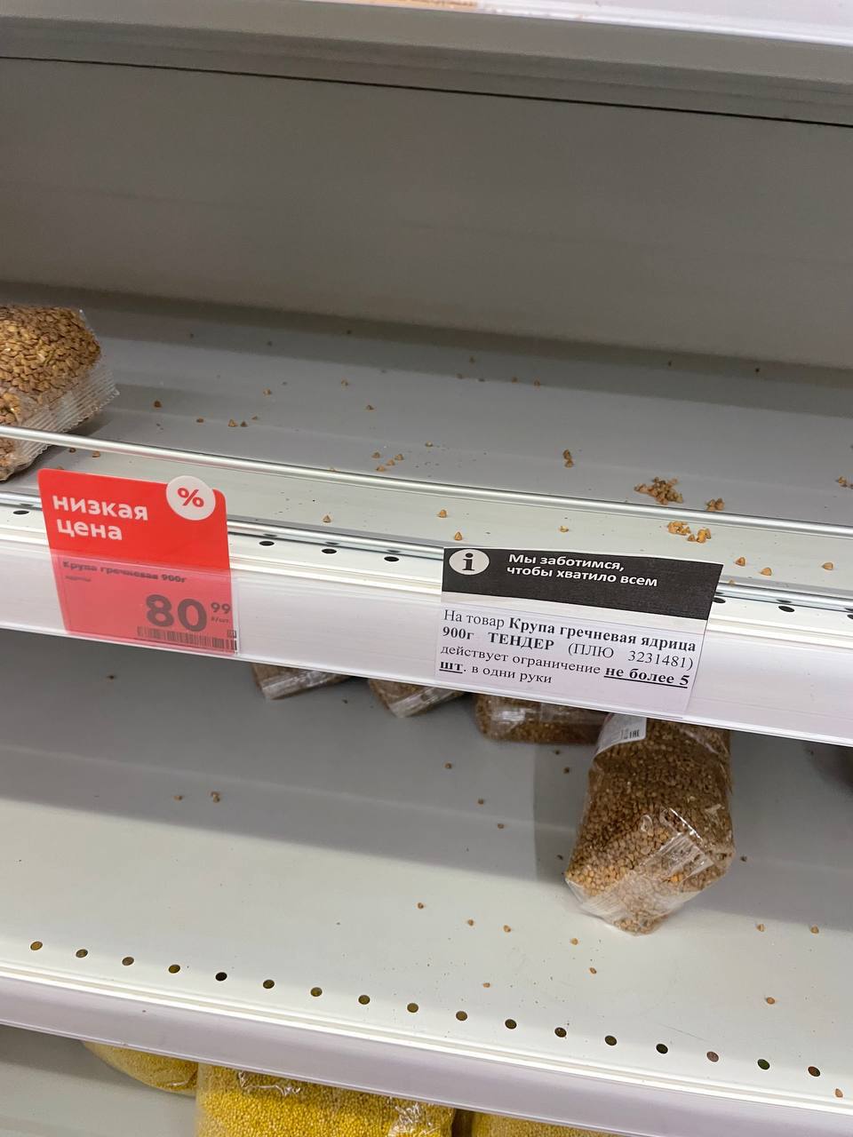 19.02 В супермаркетах в Московской области люди раскупают рис, гречка, сахар - продают 5 штук в одни руки. И самые дешёвые сорта раскупили полностью. На не самые дешёвые сорта ограничений нет и они в наличии.