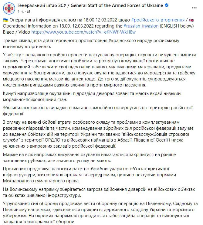 В субботу, 12 марта, идет семнадцатый день войны в Украине. Войска РФ продолжают окружать Киев, утром войска РФ сбросили на Васильков минимум 6 ракет. Поврежден склад с боеприпасами
