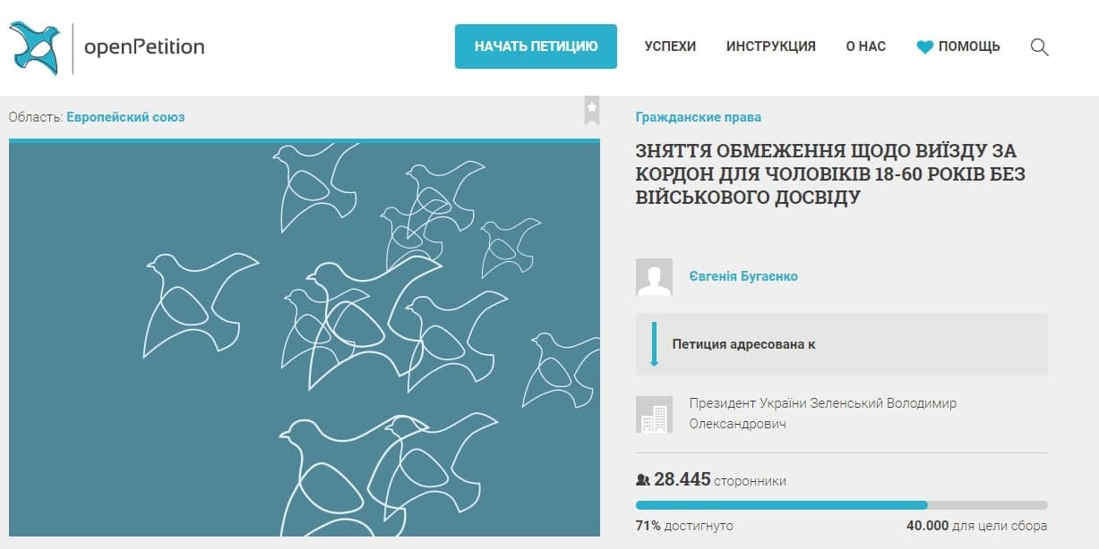 22.42 На одной из крупнейших в Европе платформ цифровой демократии - сайте Openpetition - появилась злободневная петиция Зеленскому. Она требует отменить ограничения по выезду за границу для мужчин 18-60 лет без военного опыта.