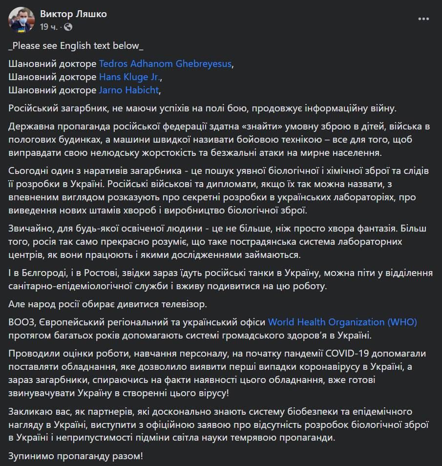 "ВОЗ, Европейский региональный и украинский офисы World Health Organization на протяжении многих лет помогают системе общественного здоровья в Украине. Проводили оценки работы, обучение персонала, в начале пандемии Covid-19 помогали поставлять оборудование, позволившее выявить первые случаи коронавируса в Украине, а теперь захватчики, опираясь на факты наличия этого оборудования, уже готовы обвинять Украину в создании этого вируса!", - написал он.