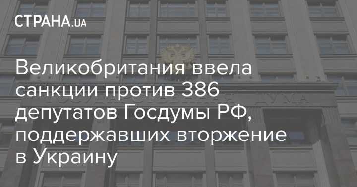 Великобритания ввела санкции против 386 депутатов Госдумы (нижняя палата парламента) России за поддержку вторжения в Украину. Об этом сообщила глава МИД Великобритании Лиз Трасс.