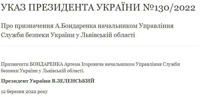 Главой СБУ Львовской области назначен Артем Бондаренко, который до этого занимал пост заместителя начальника областного управления СБУ.