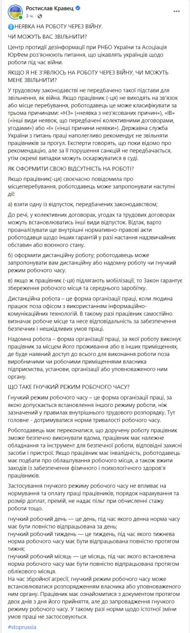 "В трудовом законодательстве не предусмотрено такого основания для увольнения, как война. Если работник (-ца) не выходят на связь или место нахождения, работодатель это может классифицировать по трем причинам: "НЗ" ("неявка по невыясненным причинам"), "ИС" ("другие виды неявок, предусмотренные коллективными договорами, соглашениями") или "И" ("другие причины неявки"). Государственная служба Украины по вопросам труда настоятельно рекомендует не увольнять работников за прогул. Эксперты говорят, что пока известно о рекомендации, но за ее нарушение санкций не предусматривается, впрочем, отдельные случаи могут обжаловаться в суде", - говорится в сообщении.