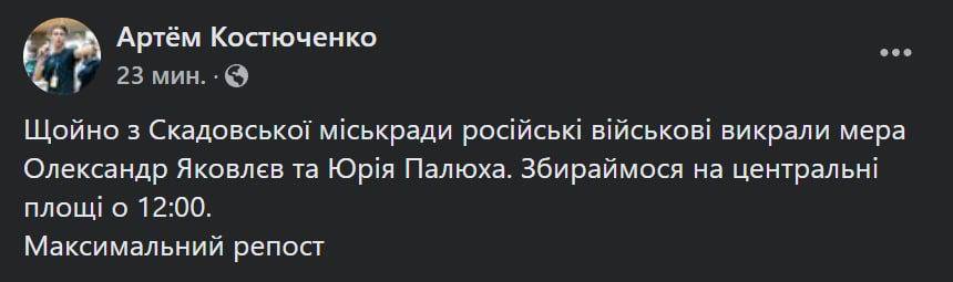 Российские оккупанты похитили мэра Скадовска Александра Яковлева и его заместителя Юрия Палюха. Об этом в соцсети сообщил активист Артем Костюченко и призвал горожан собираться на центральной площади города.