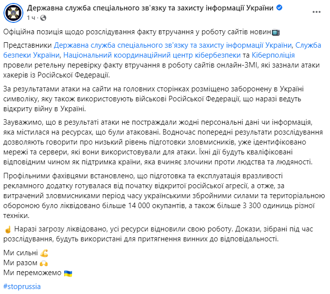 Госспецсвязи и СБУ уже подтвердило, что к атаке причастны российские хакеры, а также добавили, что персональные данные не пострадали, а проблема уже устранена.