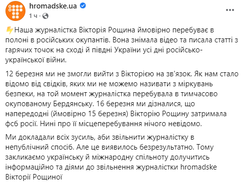 "12 марта мы не смогли связаться с Викторией. Как стало известно от свидетелей, которых мы не можем называть по соображениям безопасности, на тот момент (момент задержания - Ред.) журналистка находилась во временно оккупированном Бердянске. 16 марта мы узнали, что накануне (вероятно 15 марта) Викторию Рощину задержало ФСБ РФ. Теперь о ее местонахождении ничего не известно", -  говорится в сообщении.