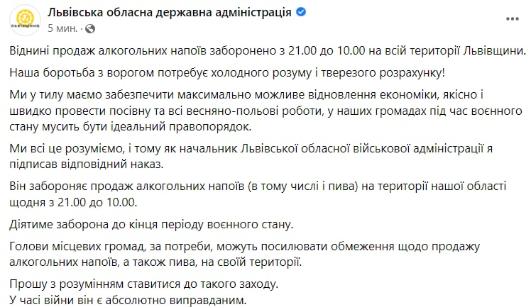 "Отныне продажа алкогольных напитков запрещена с 21:00 до 10:00 на всей территории Львовщины. Наша борьба с врагом нуждается в холодном уме и трезвом расчете! Мы в тылу должны обеспечить максимально возможное восстановление экономики, качественно и быстро провести посевную и все весенне-полевые работы, в наших общинах во время военного положения должен быть идеальный правопорядок", - указано в публикации.