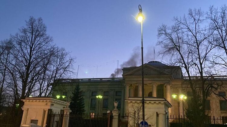 Над зданием посольства Российской Федерации в Польше поднимается дым.