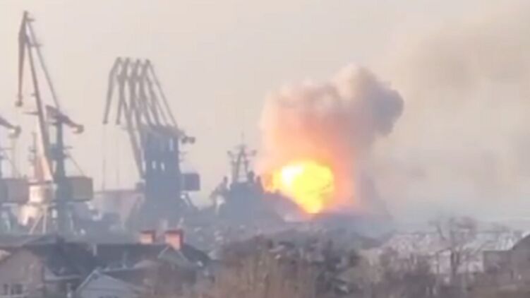 В соцсетях появилось видео, на котором, как утверждается, запечатлен момент поражения российского десантного корабля "Орск" в занятом войсками РФ порту Бердянска.