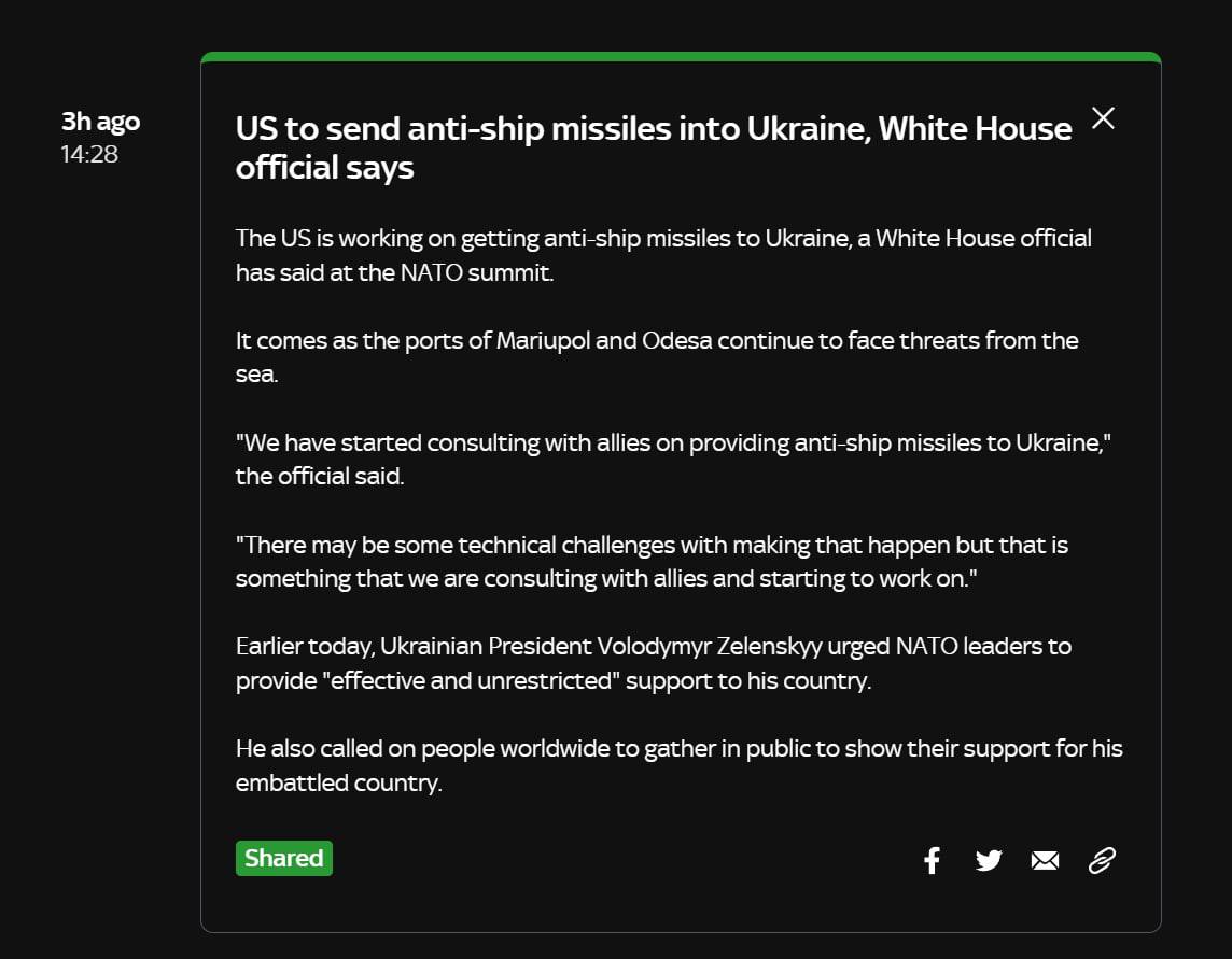 "Мы начали консультации с союзниками по поводу предоставления Украине противокорабельных ракет. С этим могут возникнуть некоторые технические проблемы, но это то, над чем мы консультируемся с союзниками и начинаем работать", - сказал чиновник.