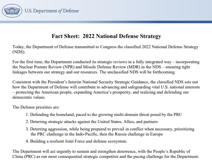 07.36 Пентагон представил Конгрессу оборонную стратегию - 2022. Главными угрозами названы Россия и Китай.