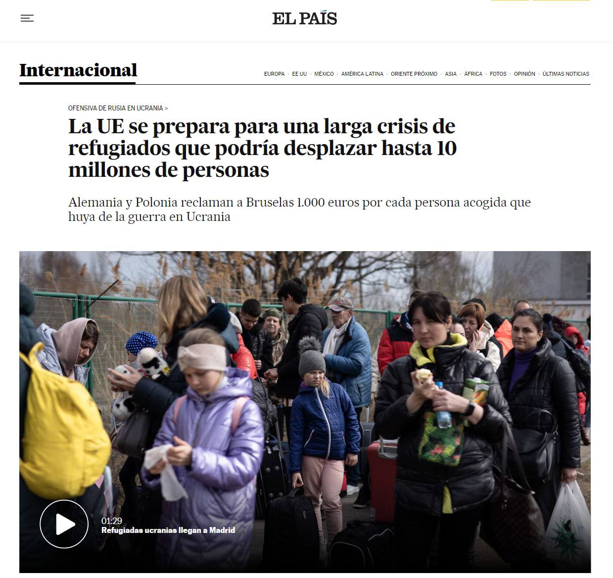 10.46 Число беженцев, покинувших Украину, может достигнуть 8 или даже 10 миллионов в ближайшие месяцы. Такие данные приводит газета El Pais, со ссылкой на данные ООН, полученные от европейских источников.