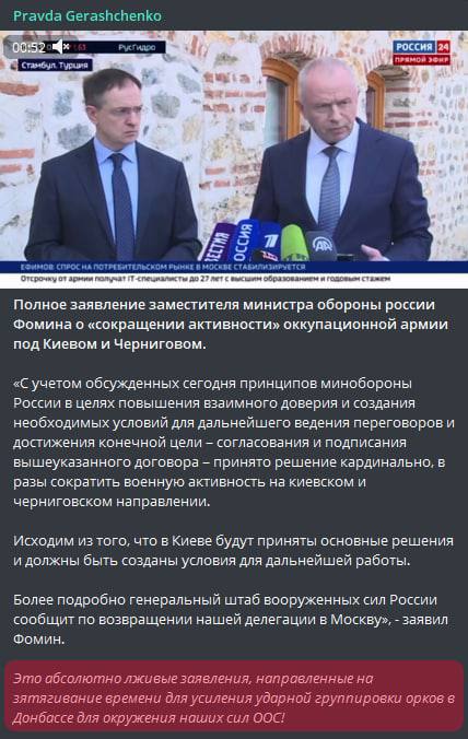 00.20 А вот мнение Миноброны Британии о заявлении России о "снижении активности" под Киевом. Считает, что убедившись в невозможности добиться окружения Киева, Россия решила сократить свою активность на этом направлении и перебросить часть сил на донецкий и луганский участки фронта.