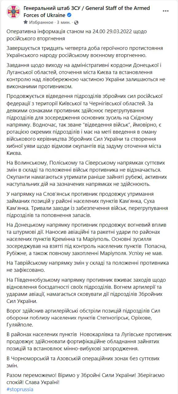 "Продолжается отведение подразделений вооруженных сил Российской Федерации с территории Киевской и Черниговской областей. По некоторым признакам противник осуществляет перегруппировку подразделений для сосредоточения основных усилий на Восточном направлении.