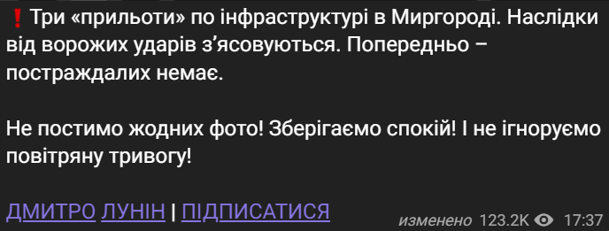 "Три прилета по инфраструктуре в Миргороде. Последствия от вражеских ударов выясняются. Предварительно пострадавших нет", - заявил глава Полтавской ОГА Лунин.