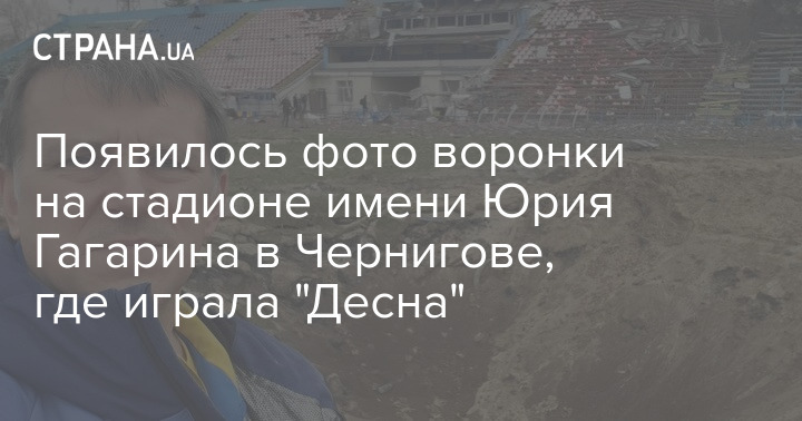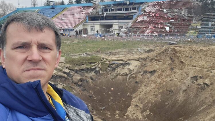 Президент федерации бобслея и скелетона Украины Михаил Гераскевич показал огромную воронку от снаряда, посреди футбольного поля на стадионе имени Юрия Гагарина в Чернигове, где играл футбольный клуб "Десна".