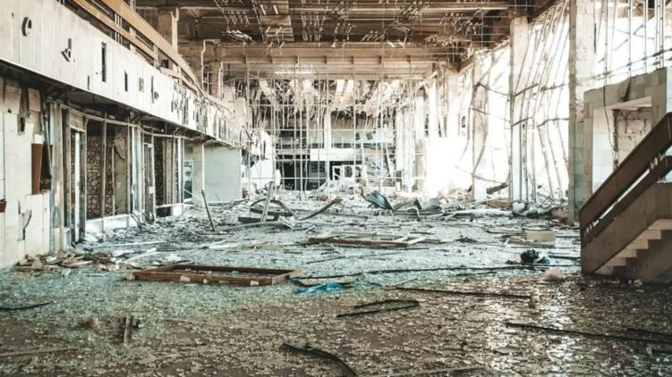 На кадрах можно заметить, что здание аэропорта практически полностью уничтожено как снаружи, так и внутри.