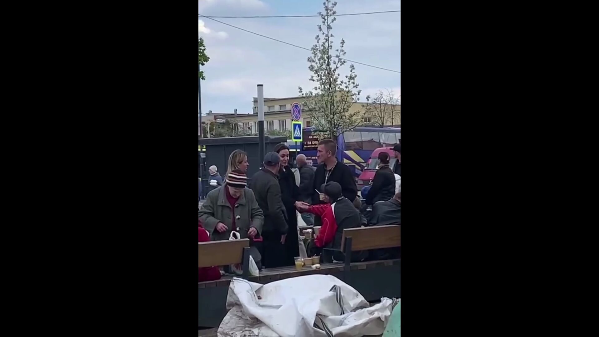 На кадрах видно, как американская актриса мило беседует с людьми, собравшимся вокруг нее, и в это время держит одного из присутствующих - сидящего на скамье мужчину - за руку. При этом на вокзале громко играет песня группы "Вопли Видоплясова".