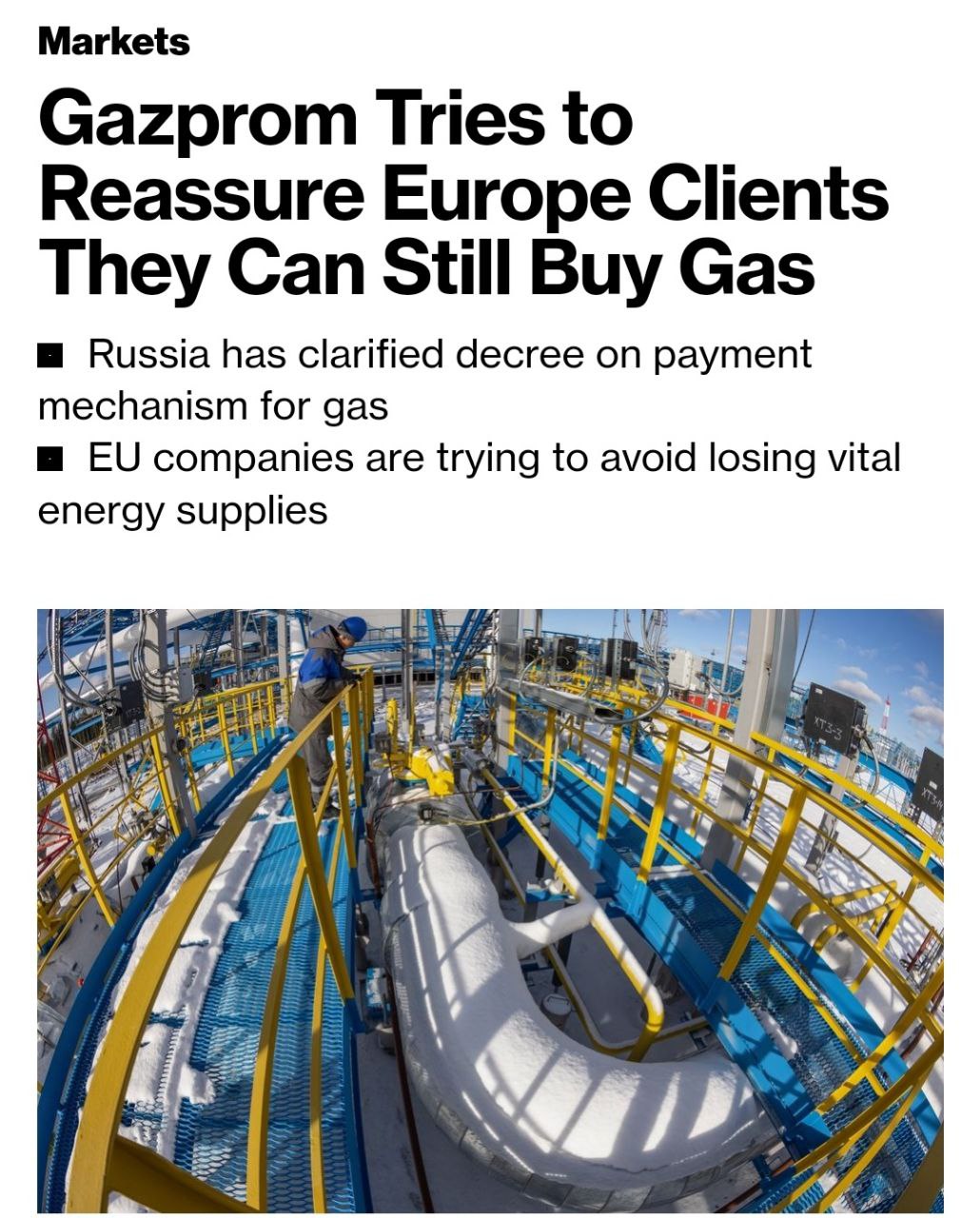 19.55 Bloomberg сообщает, что "Газпром" направил в Европу разъяснения, как оплачивать газ в рублях.