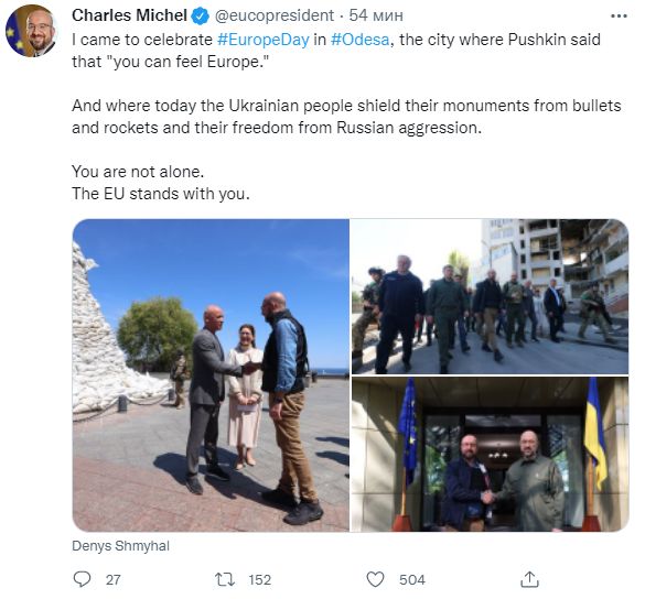 "Я приехал праздновать День Европы в Одессу, город, о котором Пушкин говорил, что "можно почувствовать Европу". Где сегодня украинский народ защищает свои памятники от ракет и свободу от российской агрессии. Вы не одиноки. ЕС поддерживает вас", – написал Шарль Мишель.