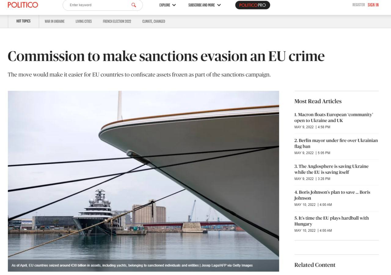 По состоянию на апрель страны ЕС конфисковали активы на сумму около 30 миллиардов евро, включая яхты, виллы и предметы искусства, принадлежащие физическим и юридическим лицам, находящимся под санкциями. Эта цифра, вероятно, увеличилась с тех пор, пишет Politico.