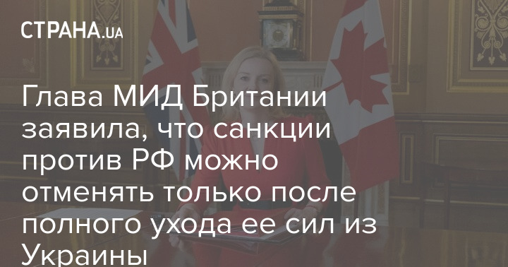 Санкции против РФ нельзя отменять вплоть до полного ухода российских сил со всей территории Украины. Об этом заявила глава МИД Британии Лиз Трасс на встрече с представителями G7 в Германии.