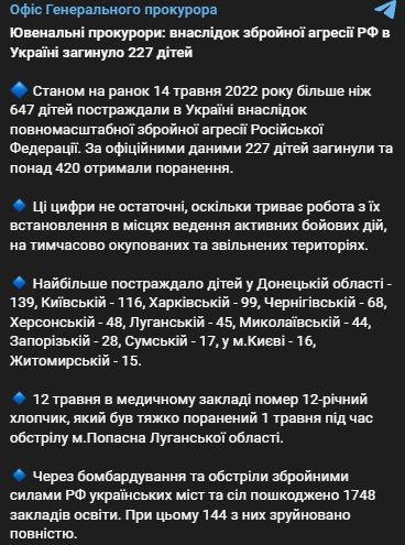 "По состоянию на утро 14 мая более 647 детей пострадали в Украине в результате полномасштабной вооруженной агрессии Российской Федерации. По официальным данным, 227 детей погибли и более 420 получили ранения", - говорится в сообщении.
