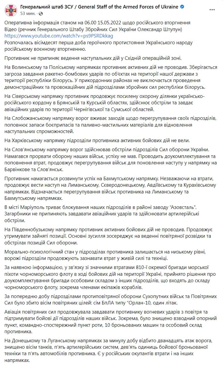 Война в Украине продолжается уже 81-й день. "Страна" следит за происходящим 15 мая в обновляемом материале.
