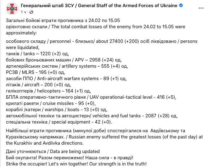 Общие боевые потери противника с 24 февраля по 15 мая ориентировочно составили: