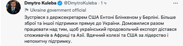 О переговорах Кулеба сообщил у себя в Twitter.