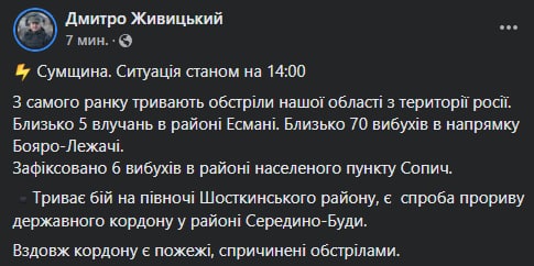 "Продолжается бой на севере Шосткинского района. Вдоль границы есть пожары, вызванные обстрелами", - сказал он.