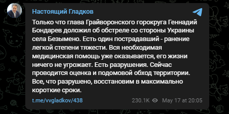 В Белгородской области сообщают, что было обстреляно село Безымено. Фото: Телеграм