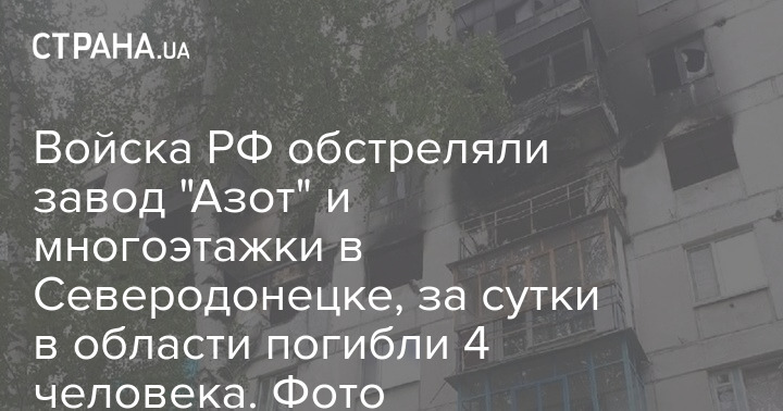 За минувшие сутки российские войска нанесли 15 артиллерийских ударов по Северодонецку Луганской области. Очередной атаке подвергся завод "Азот". В результате обстрелов в области погибли четыре человека, пострадал ребенок.