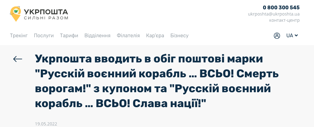 "23 мая, в День морской пехоты Украины, а также на 40-й день после трагической гибели российского военного крейсера "Москва", Укрпочта выпустит марку "Русский военный корабль… ВСЕ!", – говорится в сообщении.