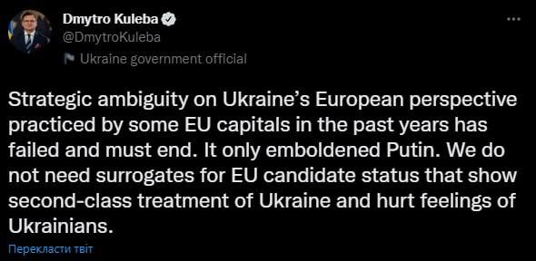 "Стратегическая неопределенность в отношении европейской перспективы Украины, практикуемая некоторыми столицами ЕС в последние годы, потерпела неудачу и должна прекратиться. Это только воодушевило Путина. Нам не нужны суррогаты статуса кандидата в ЕС, которые демонстрируют второсортное отношение к Украине и задевают чувства украинцев", - написал Кулеба в Twitter.