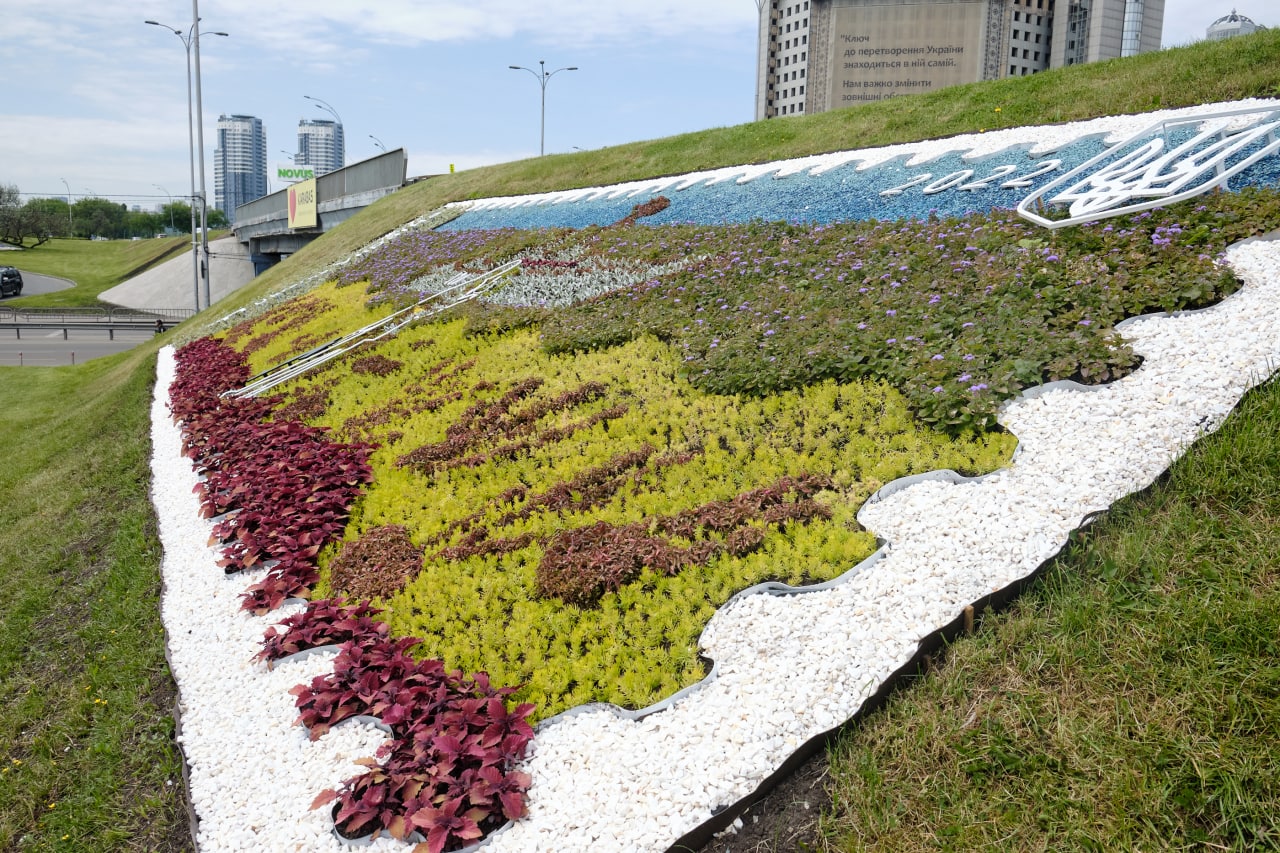 В Киеве около станции метро "Левобережная" высадили цветочную композицию с изображением известной сцены про русский военный корабль. Подобные композиции на военную тематику появятся в каждом районе столицы.