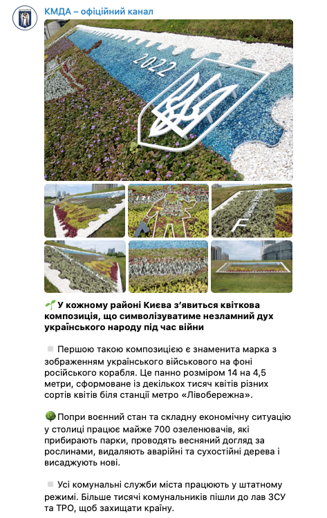 Также отмечается, что, несмотря на военное положение и сложную экономическую ситуацию, в столице работает около 700 озеленителей, которые убирают парки, проводят весенний уход за растениями, удаляют аварийные и сухостойные деревья и высаживают новые.