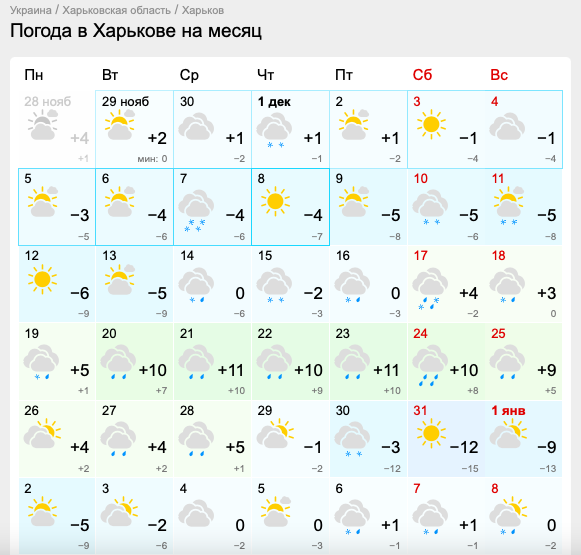 В этом плане на руку будет довольно теплая погода — сильных морозов не ожидается. Напротив, во второй половине декабря холодов вовсе не прогнозируется. Столбики термометров в Киеве, Харькове, Львове будут подниматься днем до +10, а в Одессе — до +14.