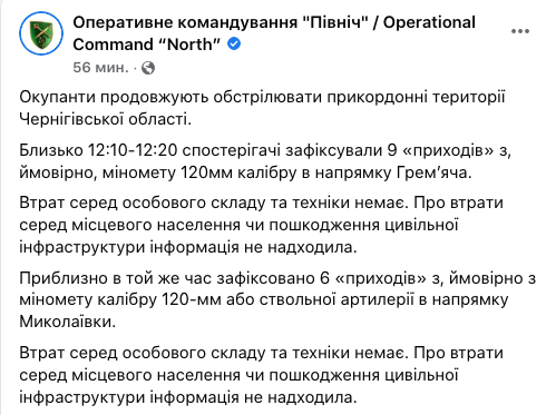 В ВСУ заявили об обстреле Черниговской области с территории РФ. Фото: facebook/kommander.nord