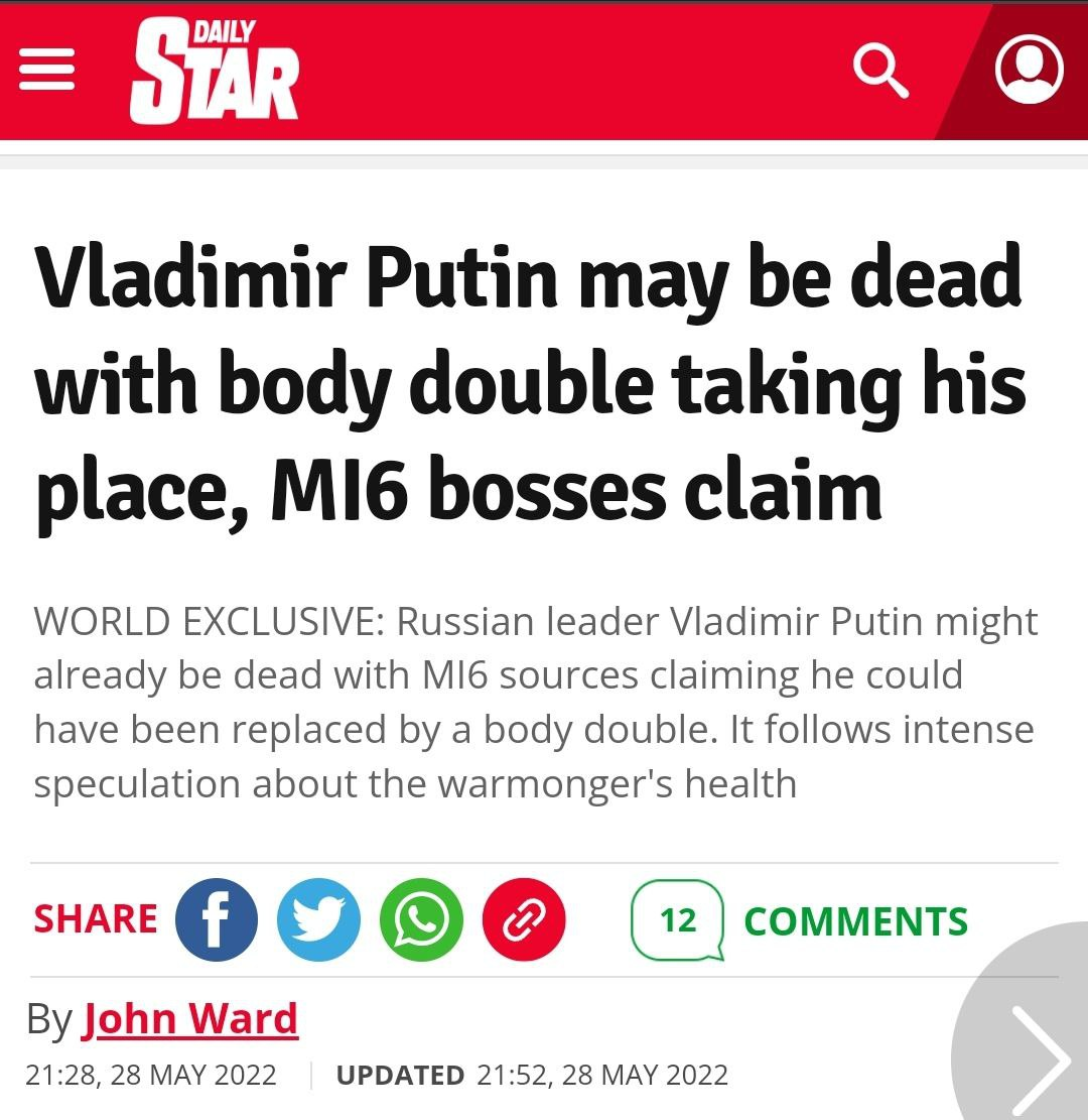 Британские СМИ пишут, что президент России Владимир Путин, возможно, уже мертв и его место занял двойник.