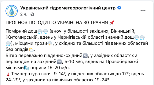 В понедельник, 30 мая, на северо-западе Украины ожидаются обильные дожди и грозы. Температура днем местами поднимется до 29 градусов.