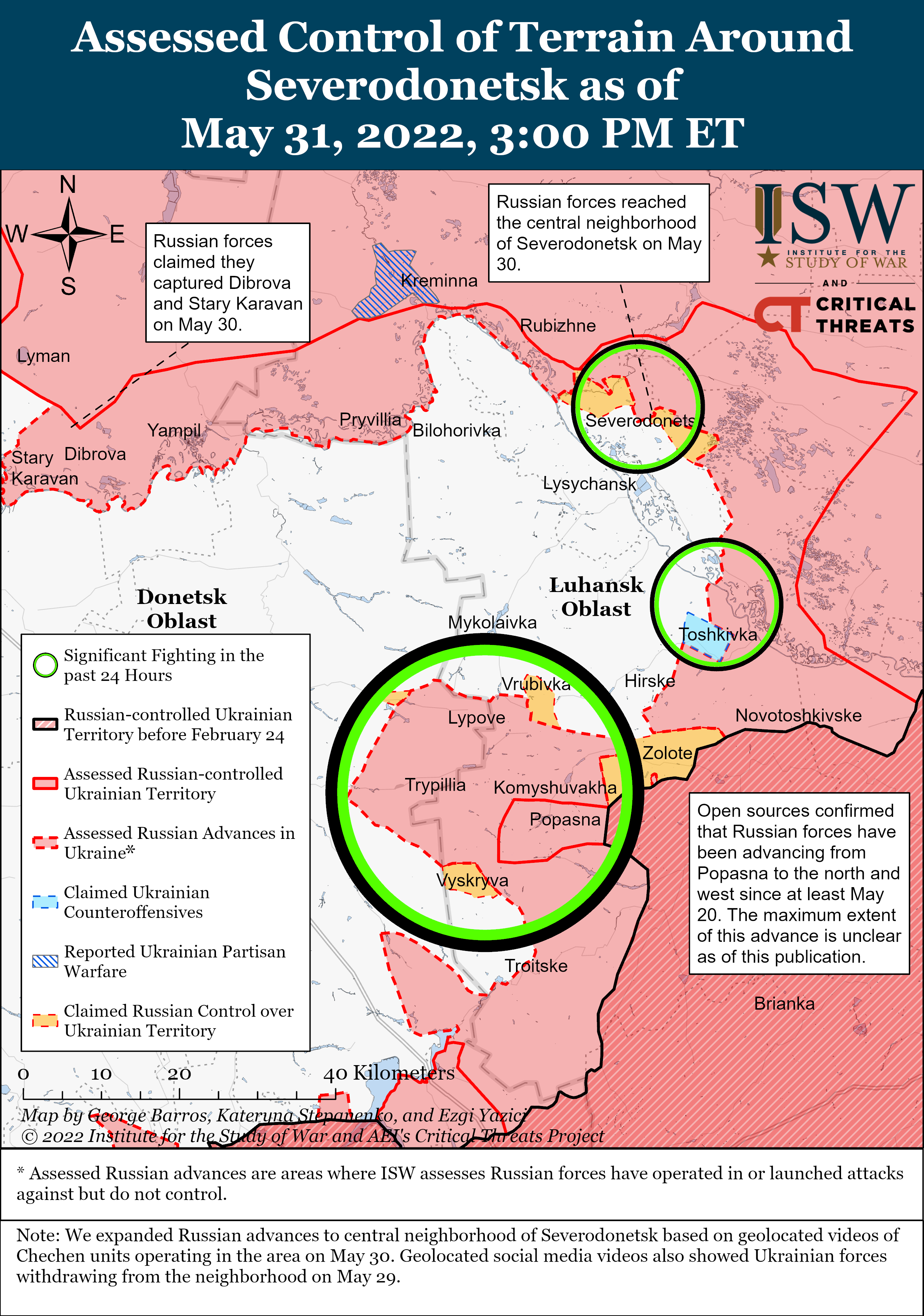 Впрочем, вряд ли город Лисичанск будут штурмовать из Северодонецка, форсируя реку. Институт изучения войны (США), например, полагает, что противник пойдет со стороны Тошковки, которая находится как раз на правом берегу Донца, к югу от Лисичанска.
