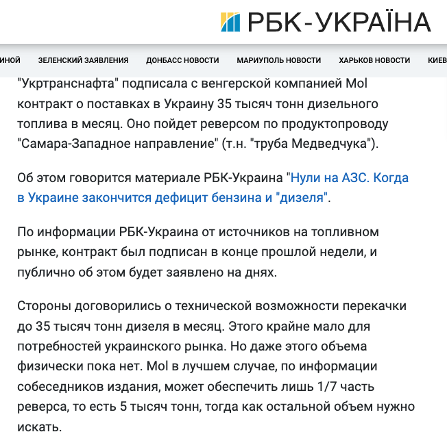 "Укртранснафта" подписала с венгерской компанией Mol контракт о поставках в Украину 35 тысяч тонн дизельного топлива в месяц. Оно пойдет реверсом по продуктопроводу "Самара-Западное направление".