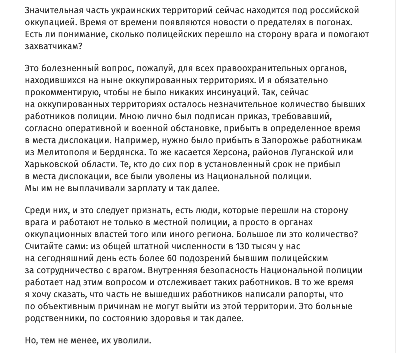 "Например, нужно было прибыть в Запорожье работникам из Мелитополя и Бердянска. То же касается Херсона, районов Луганской или Харьковской области. Те, кто до сих пор в установленный срок не прибыл в места дислокации, все были уволены из Национальной полиции. Мы им не выплачиваем зарплату и так далее", - сообщил он.