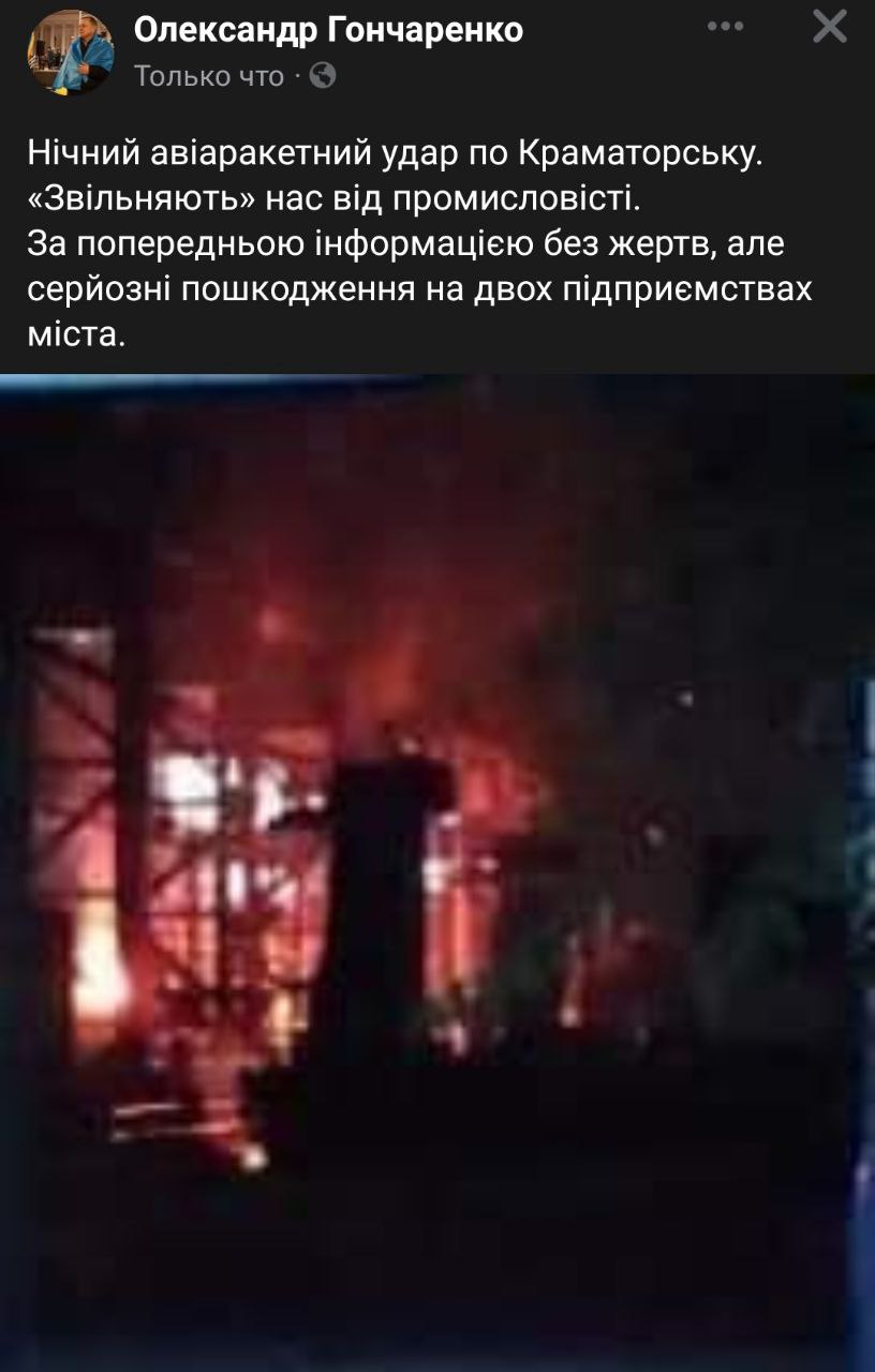 06:40 Ночной прилет по Краматорску. Мэр Александр Гончаренко сообщил о попаданиях по двум промышленным объектам.