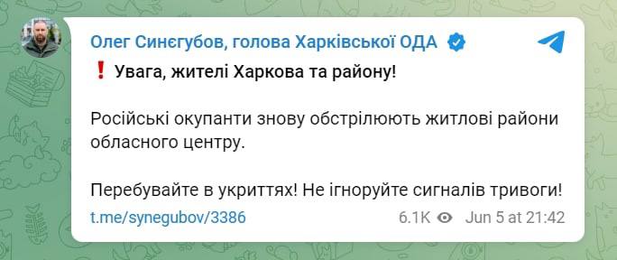 21.49 Глава Харьковской ОВА Олег Синегубов подтвердил удар по Харькову.