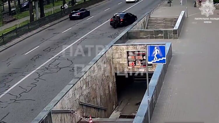 В Киеве мотоцикл Honda врезался в подрезавший его Volkswagen. Мотоциклист вылетел на пешеходную часть